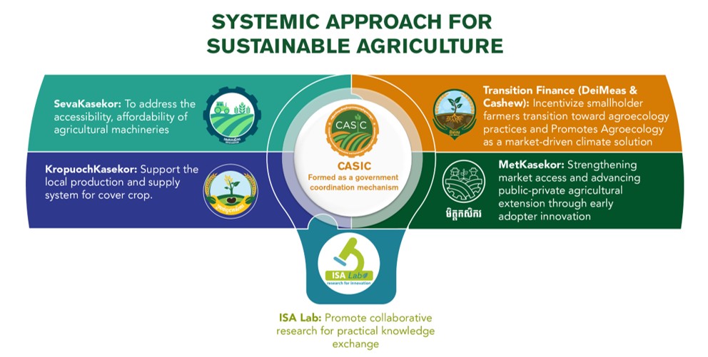 CASIC was established under the leadership of MAFF and governed by a Steering Committee chaired by MAFF with members from Ministry of Interior (MoI), Ministry of Environment (MoE), Ministry of Women’s Affairs (MoWA), Ministry of Water Resources and Meteorology (MoWRAM), Ministry of Education, Youth and Sport (MoEYS), and Cambodia Chamber of Commerce (CCC). The Steering Committee plays a crucial role in leading, directing, and supervising the progress of CA & SI and agroecological development in Cambodia, with main responsibilities in reviewing, monitoring, and approving action plans, budget and reports of CASIC.